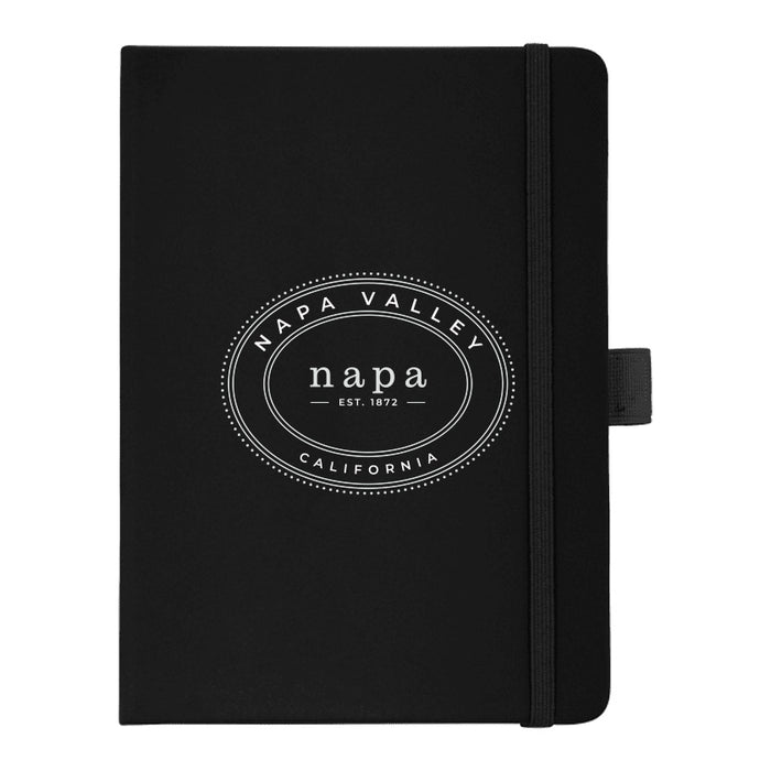 Elevate your everyday notes with this compact, hardbound journal featuring 80 ruled pages, a built-in ribbon bookmark, and secure elastic closure. Its durable cover and convenient size make it perfect for gift shops, event swag, or destination-themed retail. Add your town, logo, or slogan to make it truly your own.